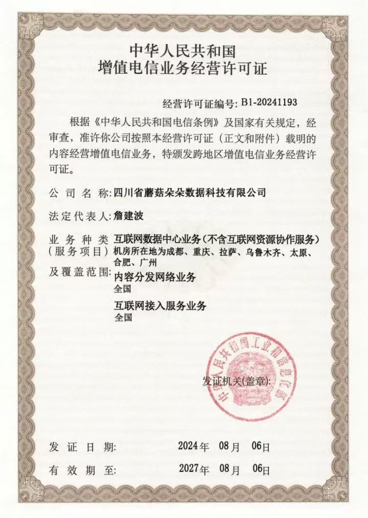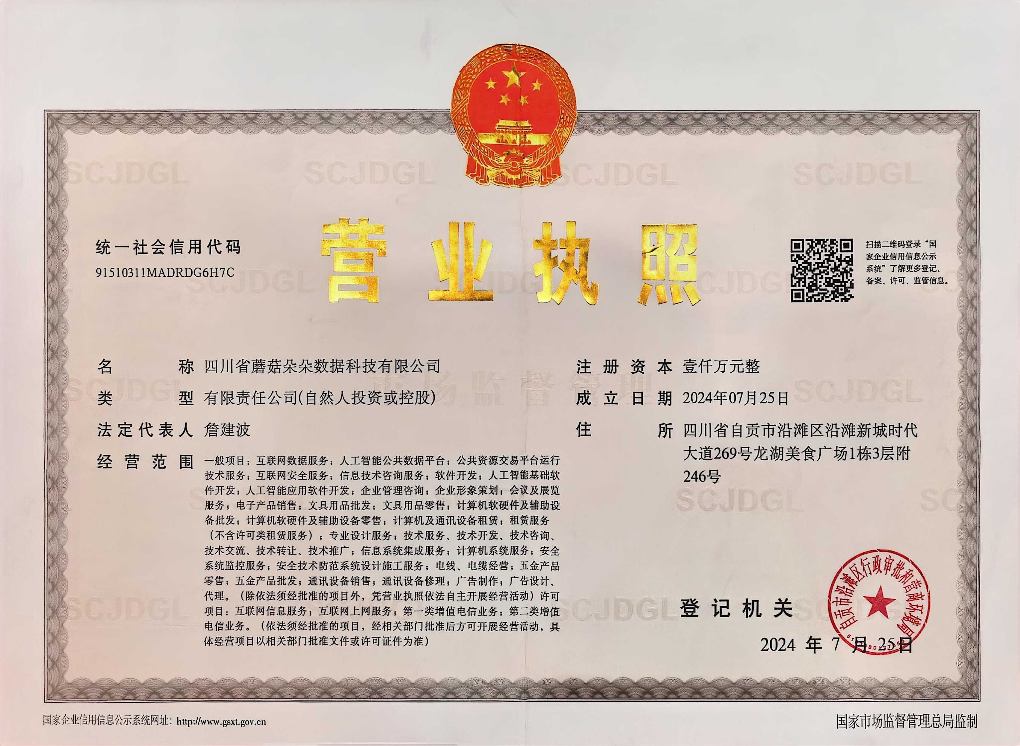 四川蘑菇朵朵数据科技有限公司已获得国家相关资质认证,合法合规经营